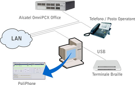 PoliPhone è un applicativo che permette di gestire un posto operatore/telefono del sistema di comunicazione Alcatel OmniPCX Office tramite PC, con l’ausilio di terminale braille, sintesi vocale e software di zoom.